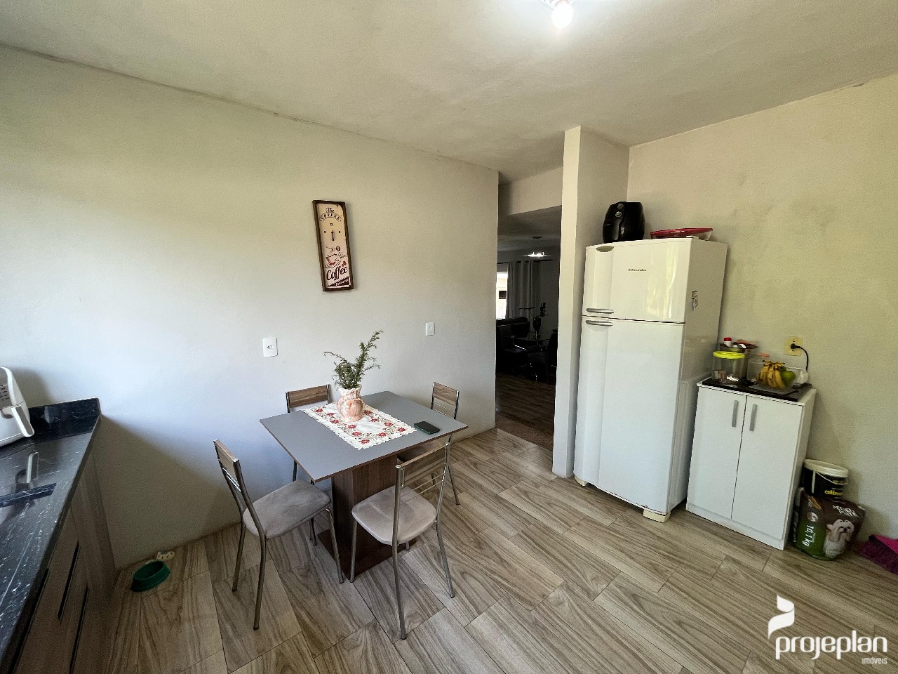 A casa possui 2 dormitórios, banheiro social, área de viver com sala de estar e jantar integradas, cozinha independente, garagem coberta para 2 carros, área de serviço, além de churrasqueira e despensa.
