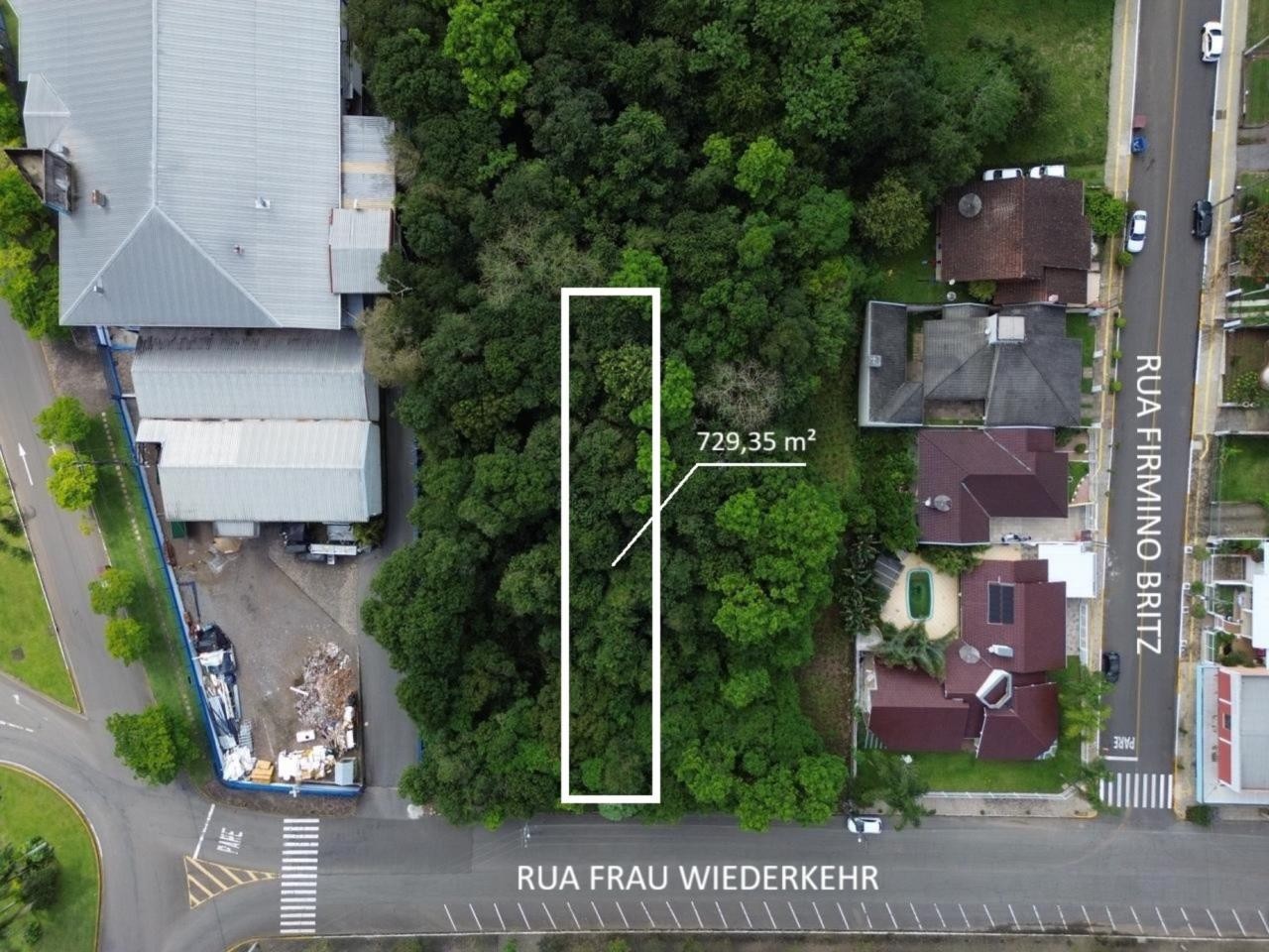 O terreno possui 729,35 m², sendo 12,57 metros de frente por 58 metros de profundidade, e está acima do nível da rua.