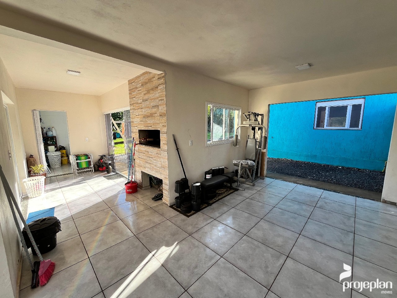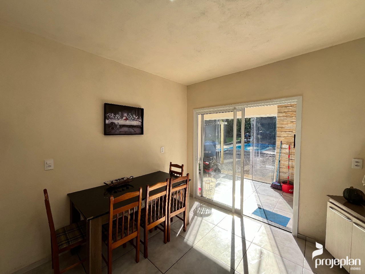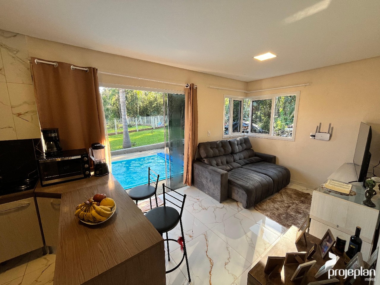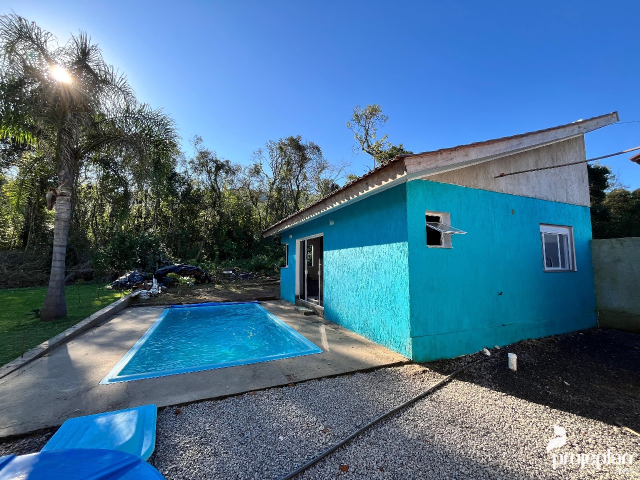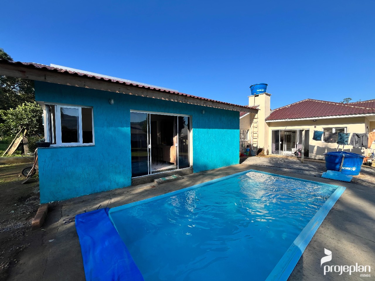 Possui uma casa com 116,80 m² dividida em sala de estar, cozinha e sala de jantar integradas, 3 dormitórios, banheiro social, garagem fechada, área de serviço e churrasqueira. Além disso, tem área de lazer com piscina e um quiosque com 49,88 m² adaptado para uma segunda moradia, que pode ser transformado em salão de festas, dividido em 2 dormitórios, sala de estar/jantar e cozinha integradas e banheiro social.