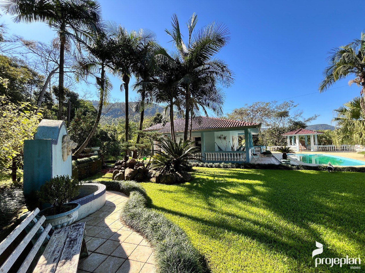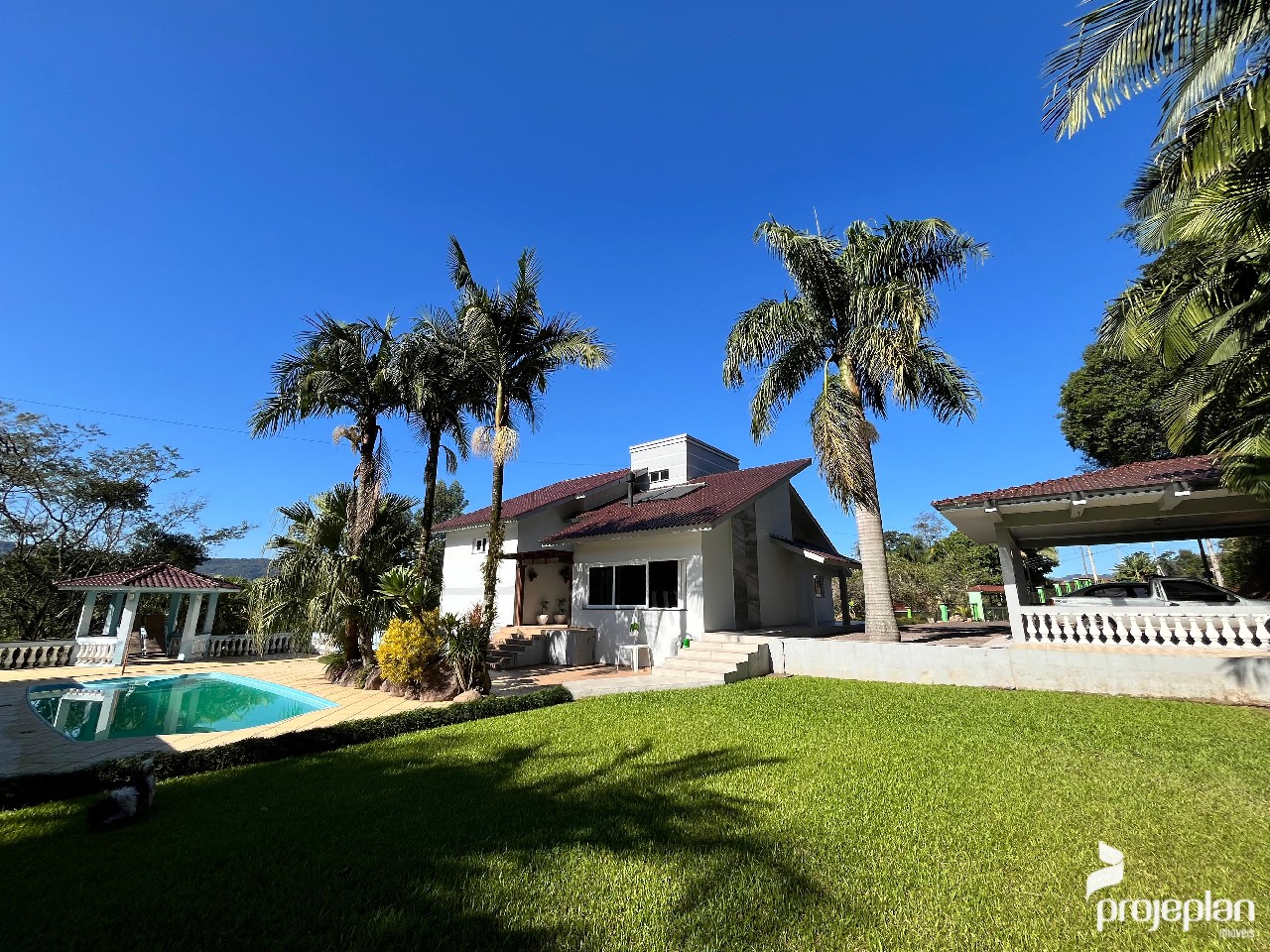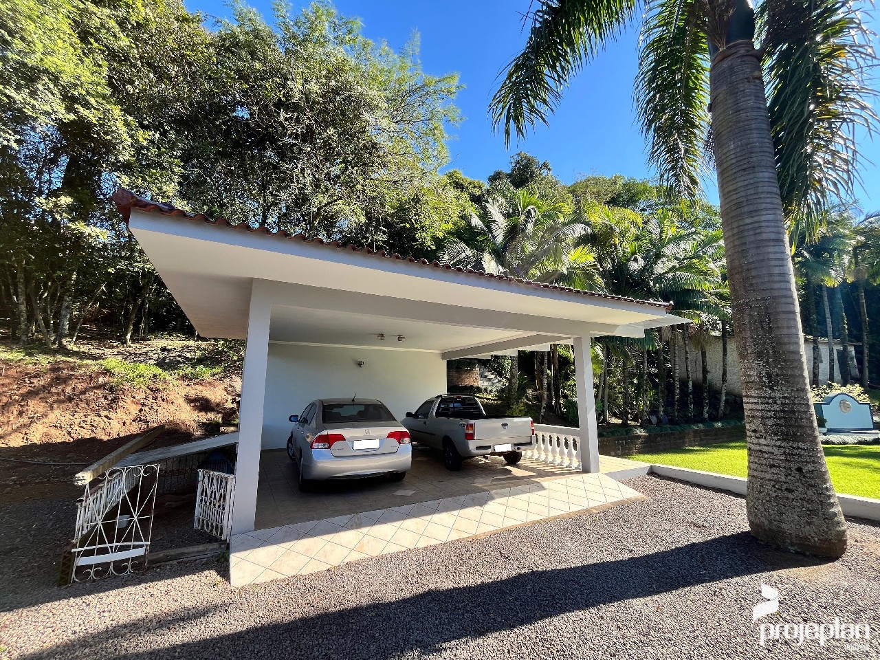 Trata-se de uma propriedade com quase 9 mil m² de área, com uma casa ampla com 3 dormitórios sendo uma suíte, área de lazer com quiosque, piscina e lindo paisagismo e garagem externa, totalizando 500 m² de área construída, e também tem uma bela área de vegetação.