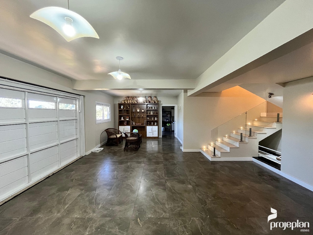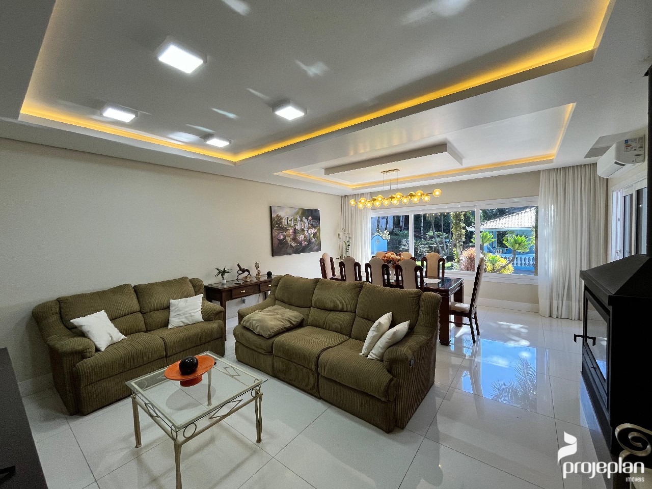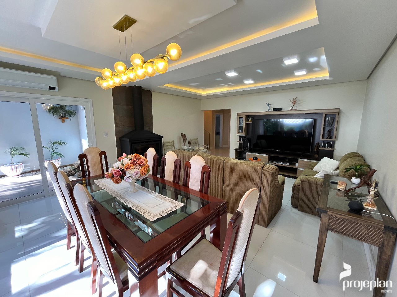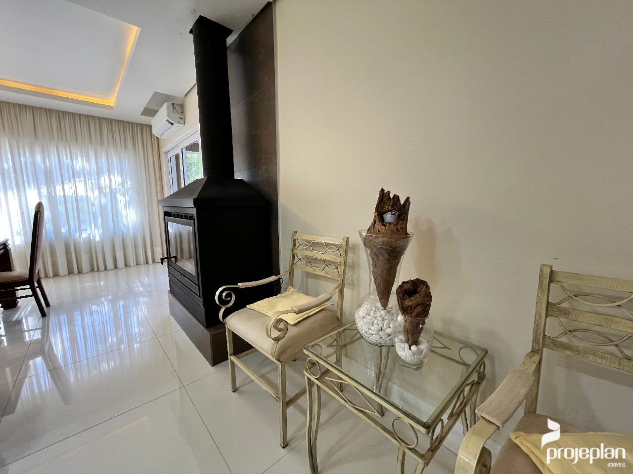 A casa conta com área social integrada com lareira e uma bela vista da piscina, 3 dormitórios sendo uma suíte com banheira de hidromassagem e 2 deles com espaço para closet, banheiro social, lavabo, cozinha ampla e funcional, adega, área de serviço, escritório e garagem interna para 2 carros e que pode ser utilizado como salão de festas. Possui ainda um espaço inacabado com 40 m².