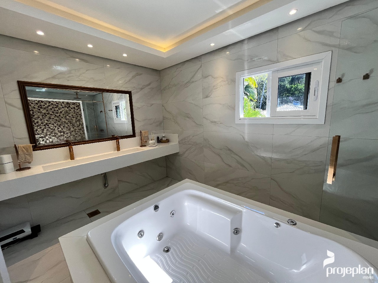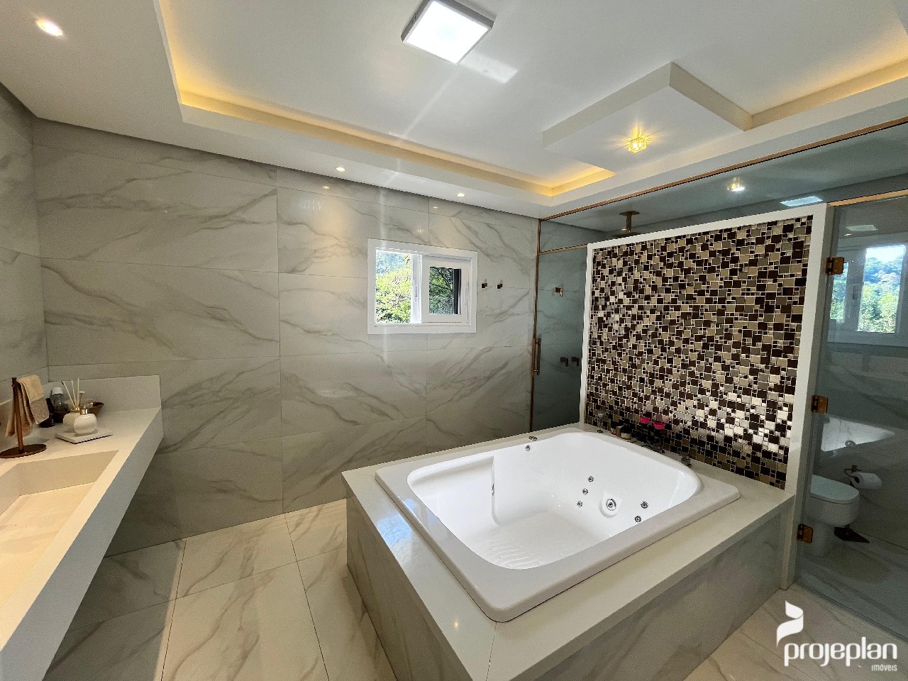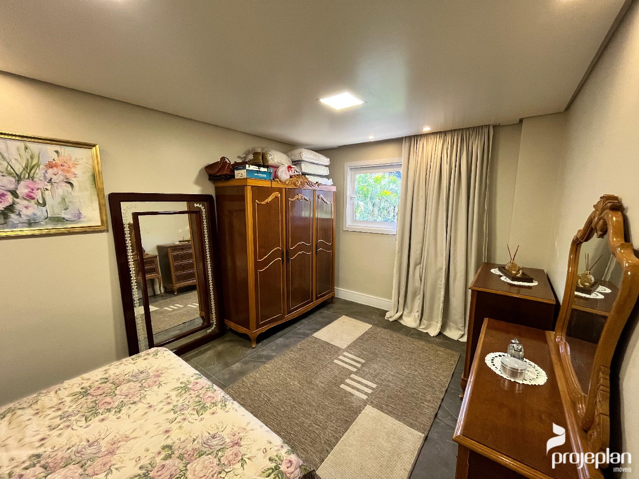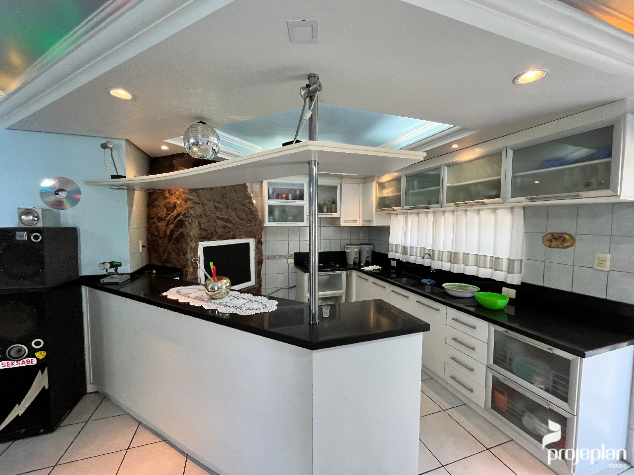 A casa conta com área social integrada com lareira e uma bela vista da piscina, 3 dormitórios sendo uma suíte com banheira de hidromassagem e 2 deles com espaço para closet, banheiro social, lavabo, cozinha ampla e funcional, adega, área de serviço, escritório e garagem interna para 2 carros e que pode ser utilizado como salão de festas. Possui ainda um espaço inacabado com 40 m².